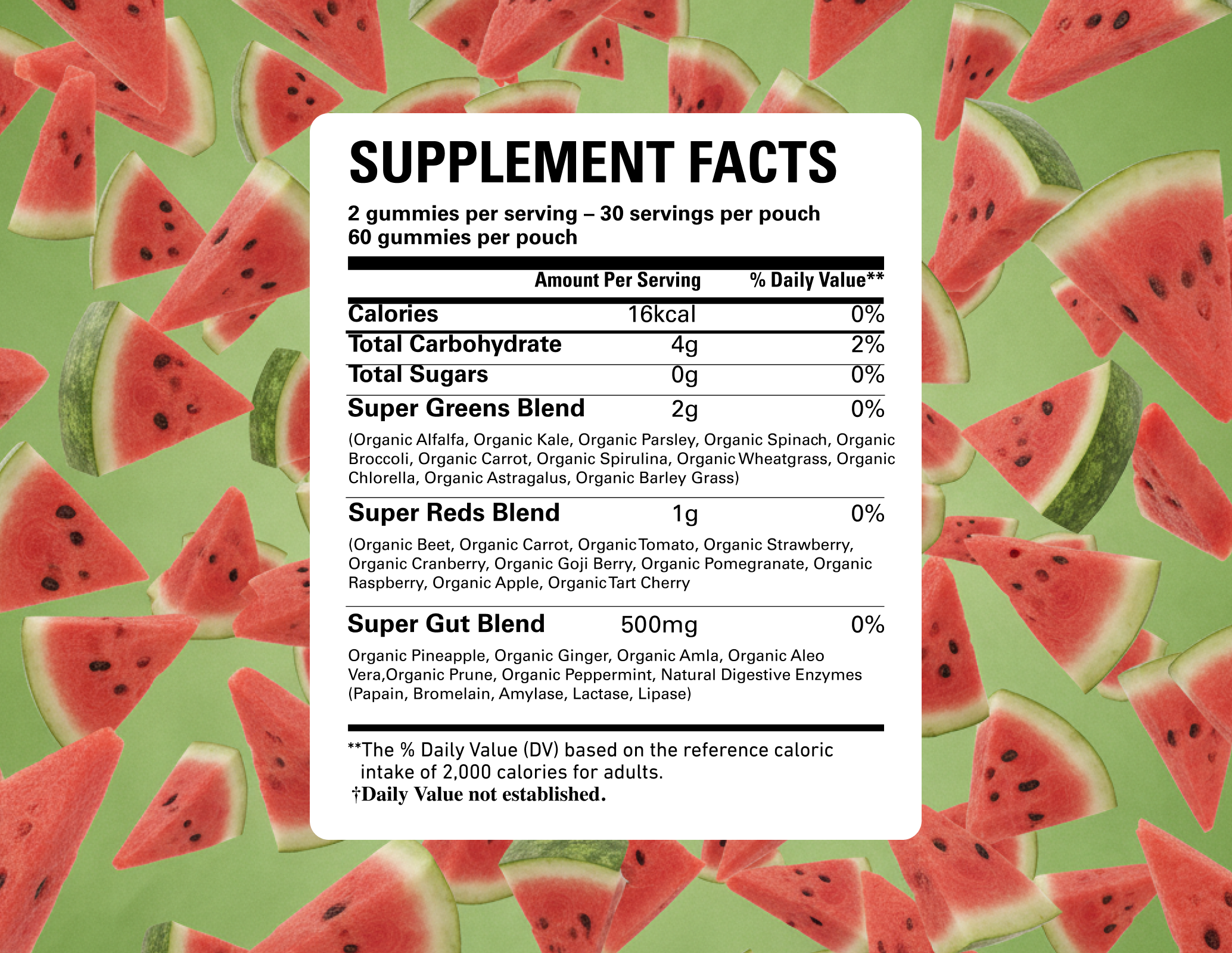 Most superfood powders taste earthy and require mixing, while capsules are hard to stick with. Our gummies combine organic greens, reds, and gut-supporting enzymes in a delicious watermelon gummy with 0g sugar — so it’s easy to stay consistent.